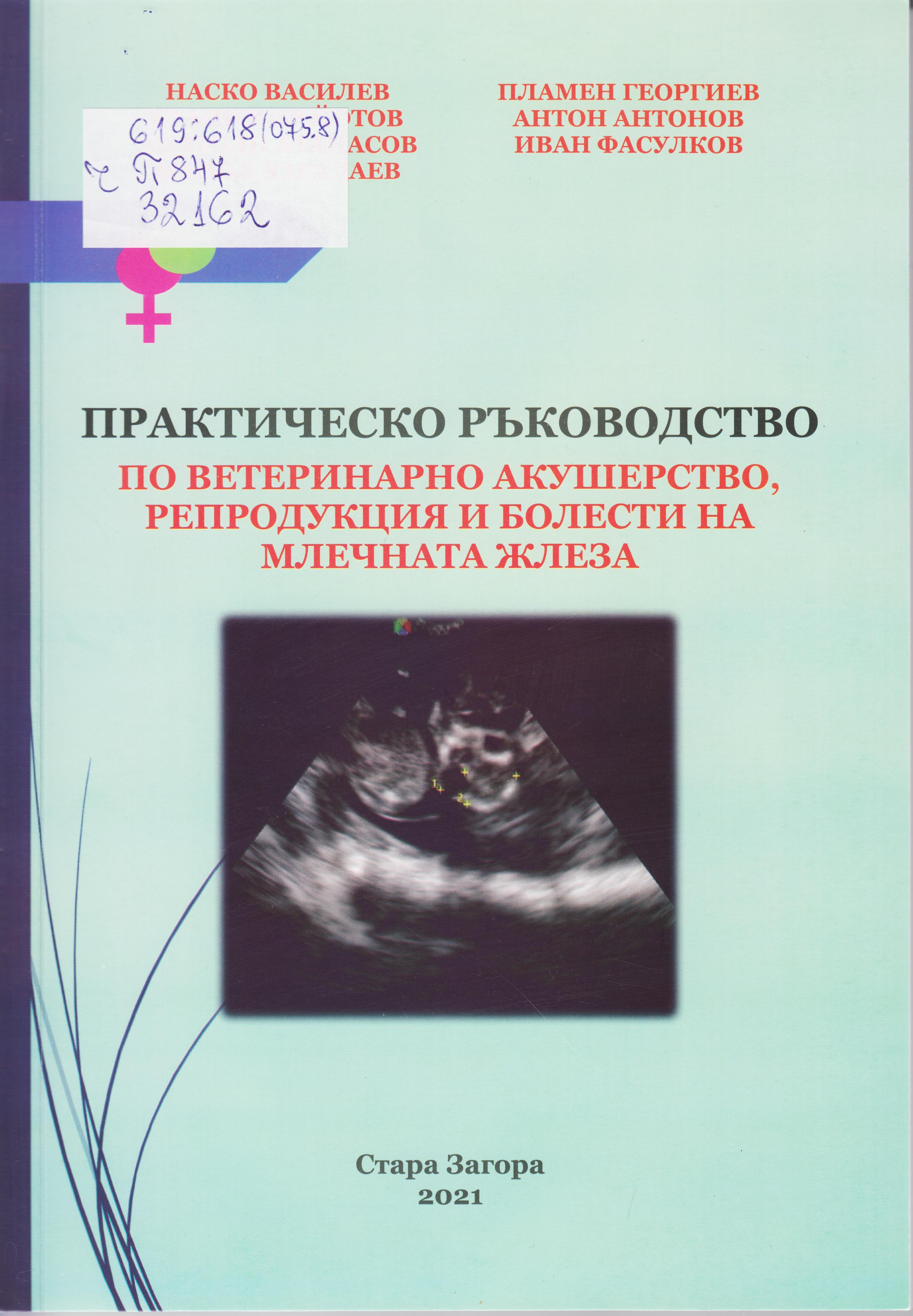 Анотация: Практическото ръководство е съставено от четири раздела. В тях са разледани въпросите, касаещи клинико-морфологични особености на женските и мъжките полови органи, контрол и направляване на половия цикъл, методите за установяване на бременността, болестни състояния през бременността, методи за извършване на акушерска помощ, следродилни усложнения, неонатология, болести на млечната жлеза, болести на женските и мъжките полови органи, получаване на семенна течност, изкуствено осеменяване и ехографско изследване на женските и мъжките полови органи. (авторите)