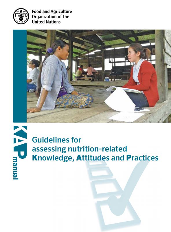 Description: The manual is written for people in charge of planning, implementing and evaluating food security and nutrition projects; these include project managers, nutritionists, health workers, planning and evaluation specialists and many others. The manual includes definitions and key indicators for nutrition- and health-related knowledge, attitudes and practices. It provides useful guidance for planning and conducting a KAP survey, and for analysing and reporting the survey results. The manual also provides model questionnaires (modules). These can be used to facilitate thedesign of KAP survey questionnaires. Using them contributes to the standardization of KAPstudies and the comparability of their results. The modules comprise predefined questionsthat capture information on critical knowledge, attitudes and practices related to most common nutrition topics (fao.org)